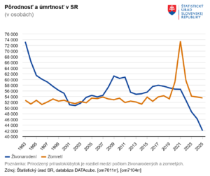 Pokles pôrodnosti na Slovensku dosiahol úroveň, ktorá nemá v modernej histórii obdobu. Podľa údajov Štatistického úradu Slovenskej republiky sa v roku 2025 narodilo na Slovensku len 42 019 detí, zatiaľ čo zomrelo až 53 520 obyvateľov. Populácia na Slovensku neustále klesá aj bez započítania migrácie. Tento negatívny trend sa každoročne prehlbuje už od obdobia pandémie, teda od roku 2021, a zatiaľ nič nenasvedčuje tomu, že by sa mal v najbližších rokoch zásadne zlepšiť.
